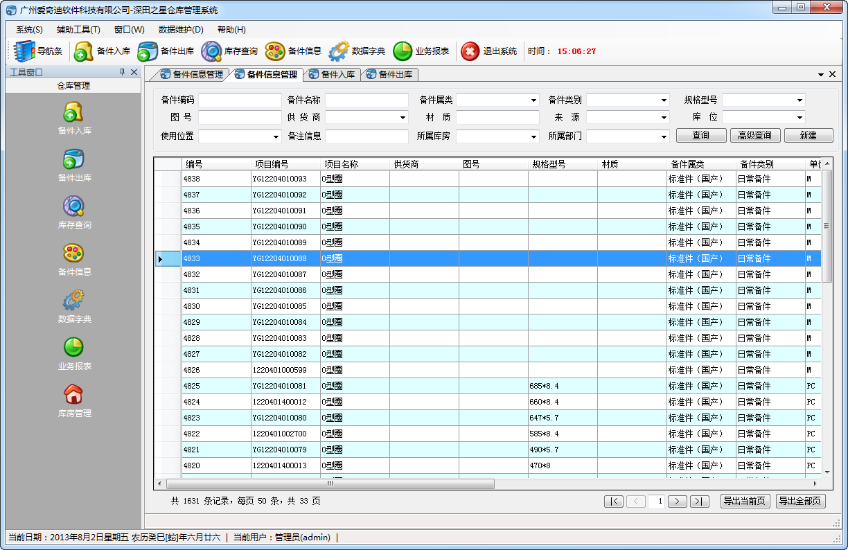備件倉庫管理系統,是一款界面友好,方便易用的倉庫管理系統,集備件信息管理、備件入庫、備件出庫、庫存查詢、庫房管理、業務報表、權限管理、數據字典管理、備件及庫存導入等功能于一體。